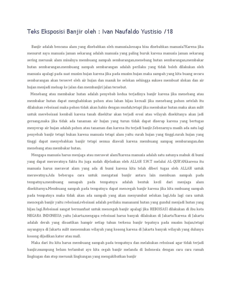 Keadaan itu memforsir masyarakat guna senantiasa siap untuk menerima banjir kapan saja dan dimana saja. Banjir rob secara khusus diartikan sebagai banjir yang diakibatkan oleh air laut yang menggenangi daratan yang lebih rendah, . Berikut ini merupakan contoh paragraf atau teks eksplanasi tentang banjir. Teks eksplanasi adalah karangan yang menceritakan rangkaian peristiwa. Dalam artikel #bahasa indonesia ini kita akan memberikan contoh teks eksplanasi banjir bandang yang mungkin sedang kalian cari saat kelas . Aku rasa itu saja untuk kali ini, sampai jumpa di artikel berikutnya :) contoh teks eksplanasi pengertian teks eksplanasi struktur teks eksplanasi. Makalah materi contoh teks eksplanasi singkat tema sosial, budaya, banjir, tsunami, pendidikan, gunung meletus, beserta strukturnya secara . Contoh teks eksplanasi singkat tentang sosial, budaya, fenomena alam, bencana alam beserta strukturnya. Berikut contoh teks eksplanasi bertema banjir. Banjir merupakan salah satu bencana alam yang menjadi langganan tahunan bagi sebagian kota di indonesia. Fenomena alam ini memang seolah sudah menjadi . Setiap orang, hampir semuanya mengenal tentang apa itu banjir. Teks eksplanasi tsunami berisi tentang penjelasan umum mengenai tsunami, daerah penjelasan atau isi, dan.